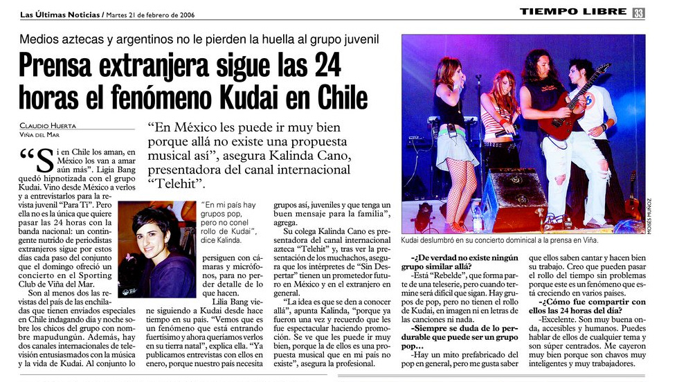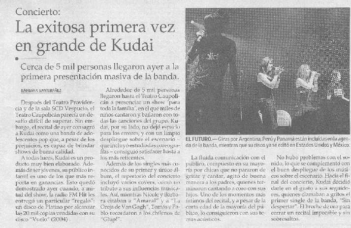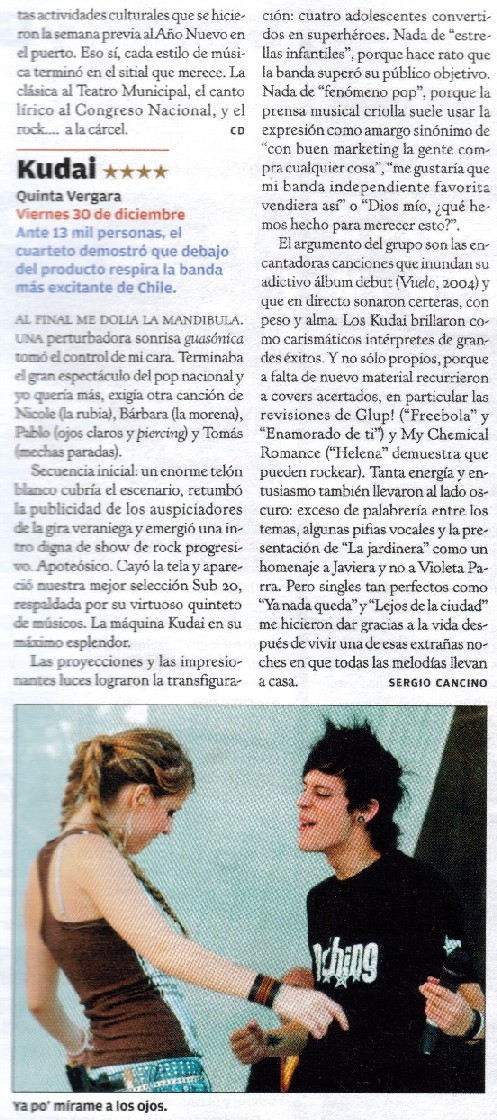 COMENTARIOS DE CONCIERTOS QUINTA VERGARA / Revista Rollingstone ""Cayó la tela y apareció nuestra mejor selección sub 20, respaldada por su virtuoso quinteto de músicos" Sergio Cancino. TEATRO CAUPOLICAN / EMOL . "No hubo problemas de sonido, lo que se complementó con el buen despliegue de los músicos sobre el escenario"Junio 2005 HARD ROCK CAFE BOGOTA / CANAL 13 SPORTING DE VIÑA DEL MAR Kudai en el Sporting y su proyección en México. Las Ultimas Noticias SPORTING DE VIÑA DEL MAR. "Kudai brinda en vivo un espectáculo con ribetes internacionales(...)Detrás están custodiándolos el mejor guitarrita, bajista, baterista y tecladista, que a la vez, interactúan con los 4 adolescente".www.fotorock.cl.