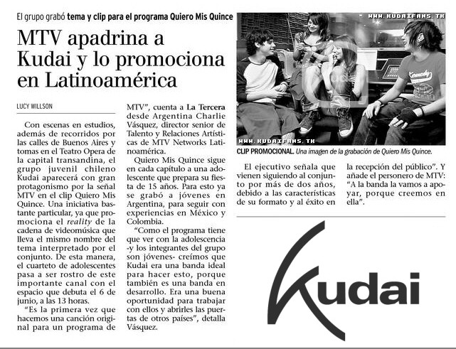 COMENTARIOS GENERALES KUDAI / Lla Tercera acerca del apoyo de Mtv a Kudai en Latinoamérica. Gentileza www.kudaifans.tk KUDAI / EL MERCURIO nueva propuesta de Kudai para su segundo disco, más Rockera. Lanzamiento de "Sobrevive"en el Teatro Caupolicán y su participación en MTV. Gentileza www.kudaivenezuela.tk ANECTDOTAS Y OTROS Mala pasada a Guitarra de Joselo por negligencia de la Linea Aérea Copa /La Cuarta |