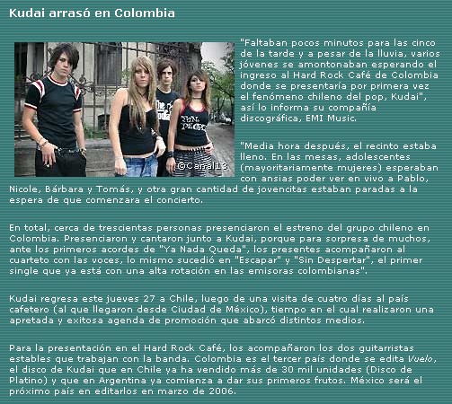 COMENTARIOS DE CONCIERTOS QUINTA VERGARA / Revista Rollingstone ""Cayó la tela y apareció nuestra mejor selección sub 20, respaldada por su virtuoso quinteto de músicos" Sergio Cancino. TEATRO CAUPOLICAN / EMOL . "No hubo problemas de sonido, lo que se complementó con el buen despliegue de los músicos sobre el escenario"Junio 2005 HARD ROCK CAFE BOGOTA / CANAL 13 SPORTING DE VIÑA DEL MAR Kudai en el Sporting y su proyección en México. Las Ultimas Noticias SPORTING DE VIÑA DEL MAR. "Kudai brinda en vivo un espectáculo con ribetes internacionales(...)Detrás están custodiándolos el mejor guitarrita, bajista, baterista y tecladista, que a la vez, interactúan con los 4 adolescente".www.fotorock.cl.