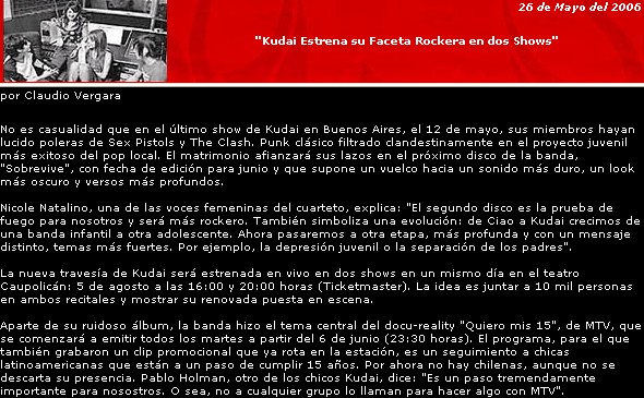 COMENTARIOS GENERALES KUDAI / Lla Tercera acerca del apoyo de Mtv a Kudai en Latinoamérica. Gentileza www.kudaifans.tk KUDAI / EL MERCURIO nueva propuesta de Kudai para su segundo disco, más Rockera. Lanzamiento de "Sobrevive"en el Teatro Caupolicán y su participación en MTV. Gentileza www.kudaivenezuela.tk ANECTDOTAS Y OTROS Mala pasada a Guitarra de Joselo por negligencia de la Linea Aérea Copa /La Cuarta |